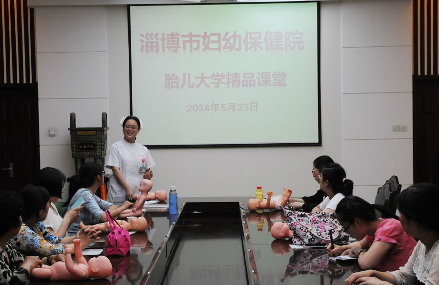 2014年5月23日下午,淄博市妇幼保健院2014年胎儿大学精品课在住院部一楼会议室首次开课。通过预约前来的15名准妈妈及其家属参加了课程,仔细地聆听了专家的讲座,并现场进行了体验、观摩。