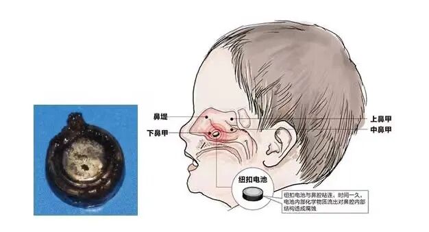 耳鼻喉科值班医生用额镜认真检查了孩子的鼻腔,发现左侧鼻腔中有异物,且鼻中隔前端破溃。
