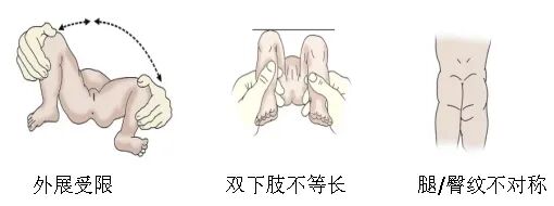 双腿一长一短,学行走后出现步态异常,单侧脱位者出现跛行,双侧脱位者表现为“鸭步”、“挺腹”、臀部明显向后抬高。