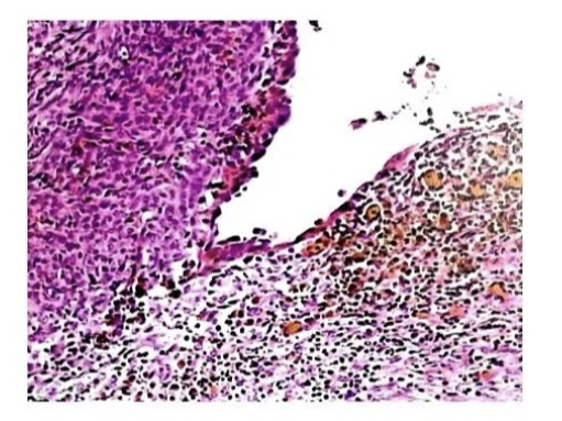 镜下表现:典型的异位囊肿大致由三部分组成,由内向外依次为陈旧性出血、宫内膜样上皮与间质、肉芽与增生的纤维组织,它们分别代表内膜异位症的功能性产物——反复出血、病变的组织学基础,以及周围组织的修复反应。