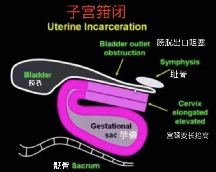 子宫箝闭是一种罕见的产科急诊,正常怀孕时,子宫是平躺在孕妇肚子里,而子宫箝闭是指子宫极度向后倾斜或屈曲,呈弧形向后弯向孕妇的骶尾部,宫颈被极度拉长,压迫膀胱颈部,导致排尿困难和下腹胀痛。