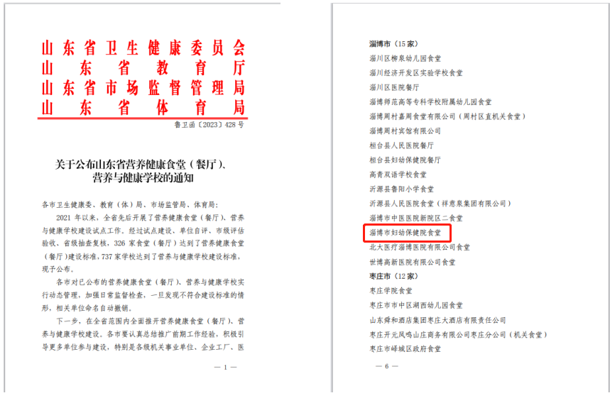 淄博市妇幼保健院食堂获评“山东省营养健康食堂”