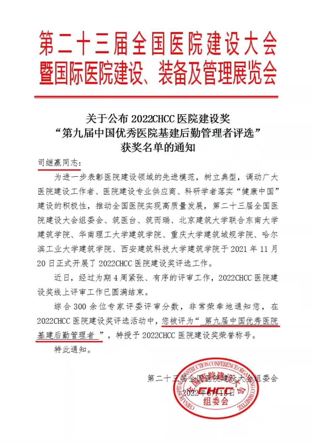 淄博市妇幼保健院基建运行科司继赢同志获得“第九届中国优秀医院基建后勤管理者”的荣誉称号