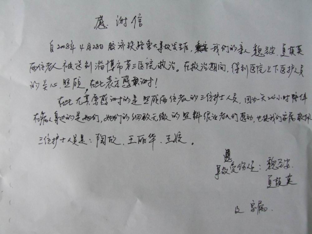 4.28胶济铁路重大事故伤员为我院发来感谢信