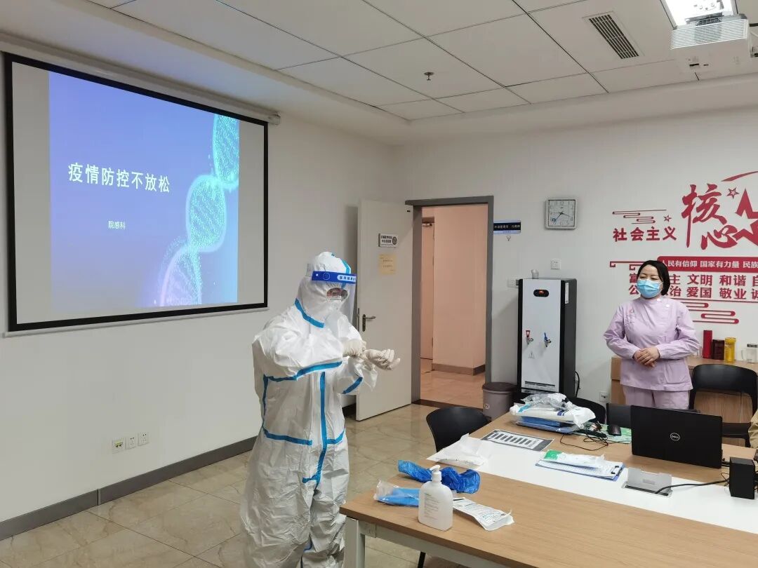 院感科主任助理杨荣和外科十楼护士长孙锦秀以新冠肺炎疫情期间医务人员的防护入手、从洗手操到环境消杀,从防护用品选择到防护服穿脱,进行了形象生动地讲解和具体的实操实战和演练指导。