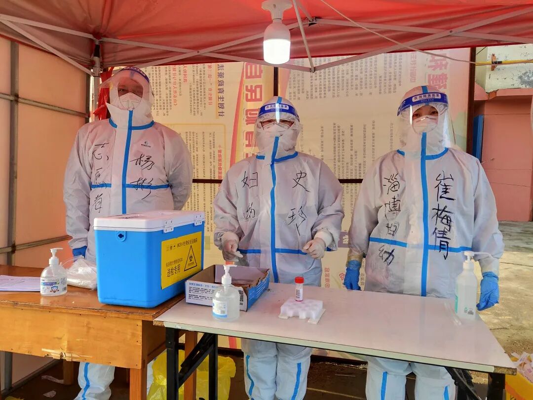 史玲、孙晓勤、王娜、杨鹏在积极承担并完成本科室工作任务之余,利用休息时间,报名参加了院志愿者服务。随着疫情发展,医院先后派遣两批医务人员对外援助。3月19日晚,史玲作为援助所在地区子女主动请缨要求前去支援,来不及告别熟睡的宝宝便踏上征程。凌晨3点,此时正在封控,漆黑的大街上一辆车也没有,坐在大巴上,她心里默念了无数遍穿脱防护服的流程。刚下大巴,还是被寒气冻了个哆嗦,此时刚迈入春天,乍暖还寒,大家拿的衣服都很单薄,第一天大家用冻僵的双手按时掰断了600余根采样棉棒。