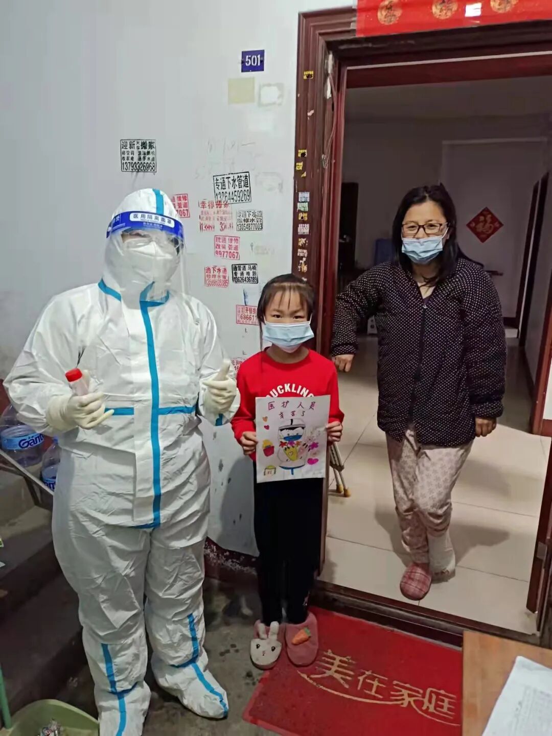 史玲主动承担起密接家属及腿脚不便者上门采样工作,防护服密不透风,汗水湿透了衣服,面罩上全是雾气,前行需要等雾气慢慢散去才能看清。一位住顶楼密接家属脚部受伤不能下楼,每次听到爬楼的声音,她都早早等在门口,看到气喘吁吁的医生十分感动,懂事的孩子第二天画了一副大白送给史玲表示感谢!