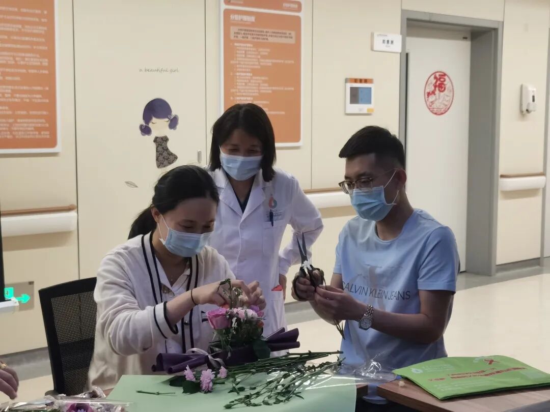 手工DIY开始了,住院孕产妇们自己动手进行插花,高低错落、红绿搭配,按照自己的想法进行创意,把满满爱意融进作品里,在爱意流动、馨香弥漫的心情里,放好贺卡,将亲手DIY的美丽花束,送给自己的母亲,在这短暂而温馨的时光里,保留下美好的回忆。