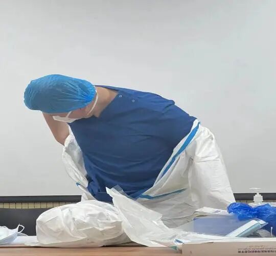 4.穿防护服,先检查防护服是否有破损,穿好后下蹲,看看防护服有没有鼓起来,判断防护服的气密性。