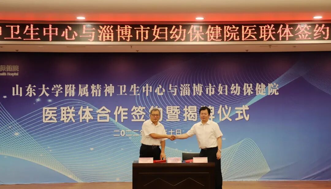 6月30日,山东大学附属精神卫生中心与淄博市妇幼保健院医联体合作签约暨揭牌仪式在淄博市妇幼保健院学术报告厅举行。仪式上为“山东省心理咨询中心合作医院”、“山东大学附属精神卫生中心合作医院”进行揭牌。山东大学附属精神卫生中心党委书记于天贵,事业发展部主任邢金水,事业发展部科员于志勇,淄博市卫健委三级调研员阚金菊,基层卫生健康科科长张毅玮,淄博市妇幼保健院党委书记张立新、党委副书记王忠德出席仪式。