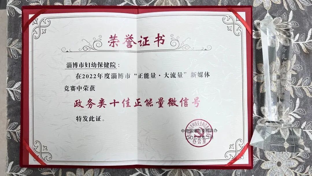 2月15日,由中共淄博市委网信办主办的2022年度淄博市“正能量·大流量”新媒体竞赛颁奖典礼举行,淄博市妇幼保健院微信公众号获政务类十佳正能量微信号荣誉称号。市委常委、宣传部部长雷霞,市委宣传部副部长、市委网信办主任傅斌出席颁奖仪式。