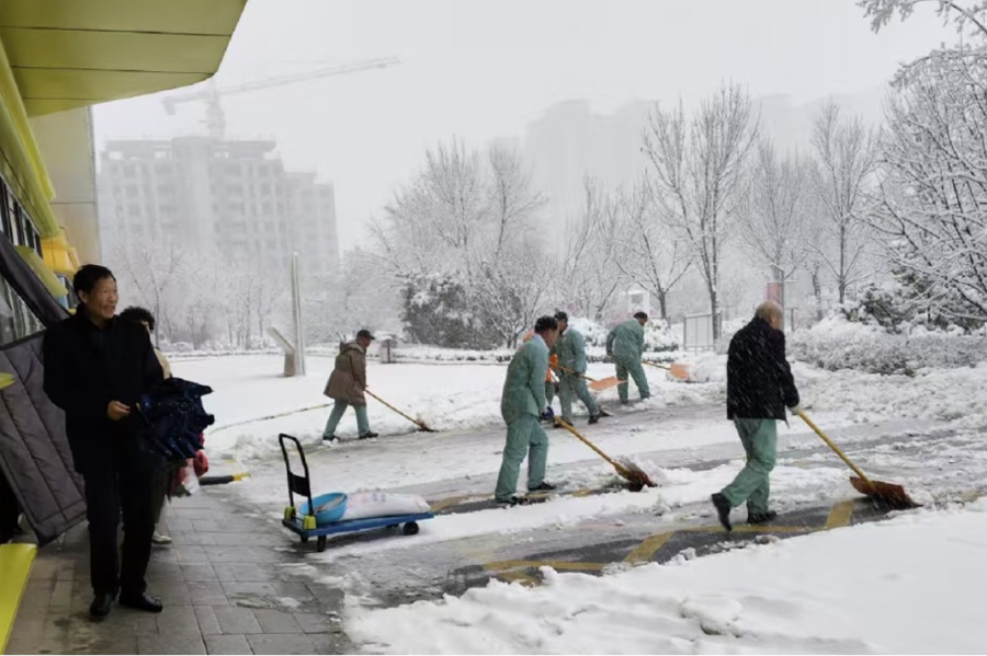 当天下午,为有效保障市民安全就诊,院领导及时统筹安排,各职能科室、保洁、保安等迅速响应,全面启动开展清雪除冰活动。期间,考虑到积雪太厚,后勤部积极协调铲车,采用机械和人工相结合的方式高效作业。一直到晚上11点30分,医院主干道及楼前道路基本清理完毕,切实保障了市民就诊安全。
