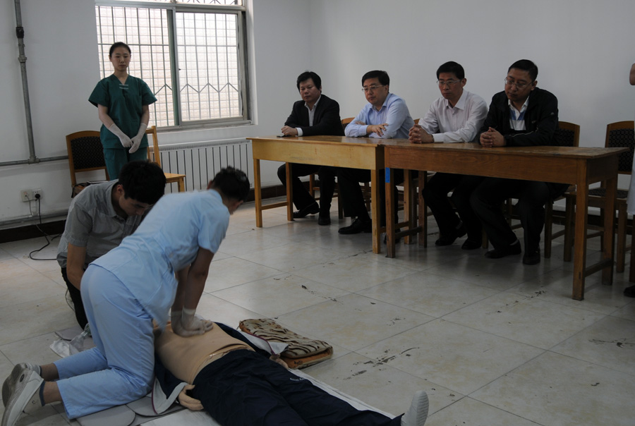 5月4日下午,院长肖洪涛、书记张立新、副院长吕春明等院领导视察了我院2015年120急救技能大赛训练和参赛准备工作,看望了正在紧张集训中的选手和指导教师们,并参观了选手们的比赛项目表演。